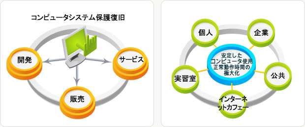 コンピュータシステム即時復旧ソリューション開発、モジュール形式ソリューション供給、パッケージソリューション販売、ソリューション活用サービス事業などです。国内外10ヶ国以上で数十万のユーザーが有用に活用しています。