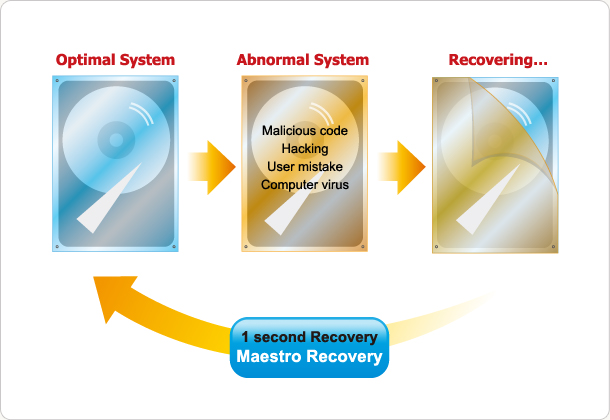 It features an instant recovery of system from all software problems occurring in a system due to computer viruses, malicious codes as well as hacking codes infiltrated into a PC through the Internet or a computer network back to the previous state completely and with ease of use.