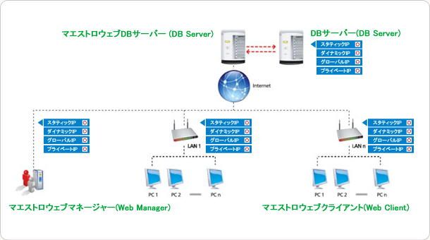 マエストロウェブは、企業及び公共機関、大学などで複数のシステムがインターネットなど外部ネットワークと接続され管理している状態で、すべてのシステムを管理権限を持った管理者が階層的に統合管理できるネットワーク(WAN)システム統合管理ソリューションです。